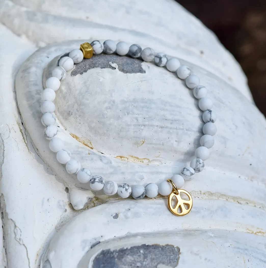 This is matte howlite with a gold vermeil peace charm. One size fits most.