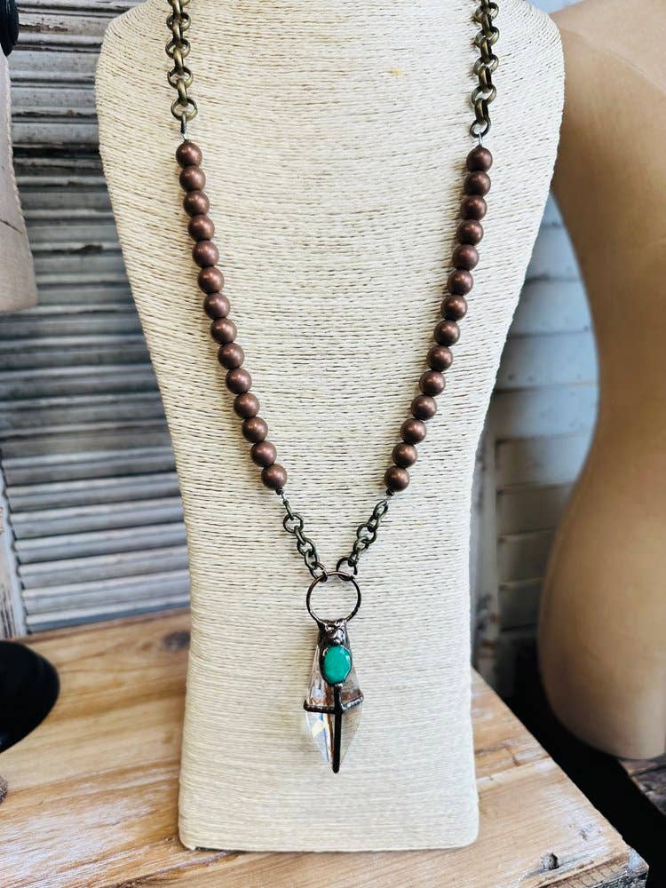 Copper Leaded Cross 32" length necklace This necklace is special and very artistic. The pendant first all is soldiered and has the cross and is account with the jade green agate stone. Full of copper beads tone metal Beads. This is one of a kind.