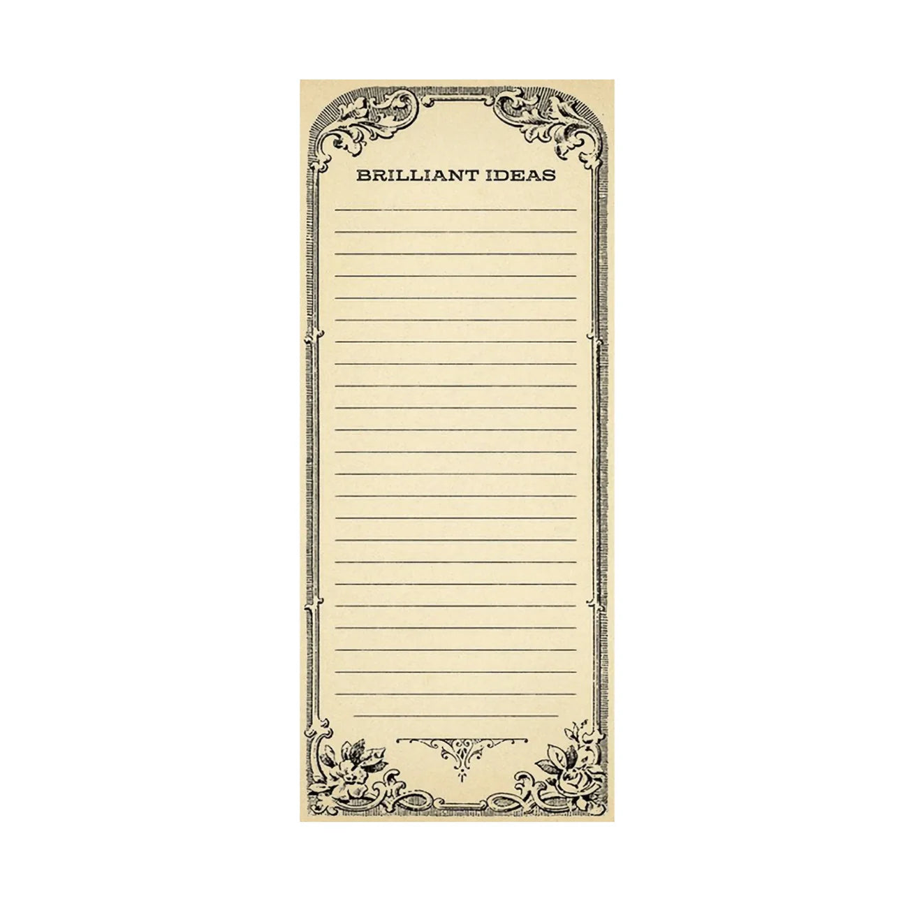 Our lined notepad with decorative borders is perfect for your brilliant ideas! Skinny enough to keep in your tote bag and just the right size to keep at your desk- our Brilliant Ideas Notepad is perfect to have handy for when inspiration strikes. Pages can easily be torn off and stuck to a fridge or tucked into a notebook or planner.<