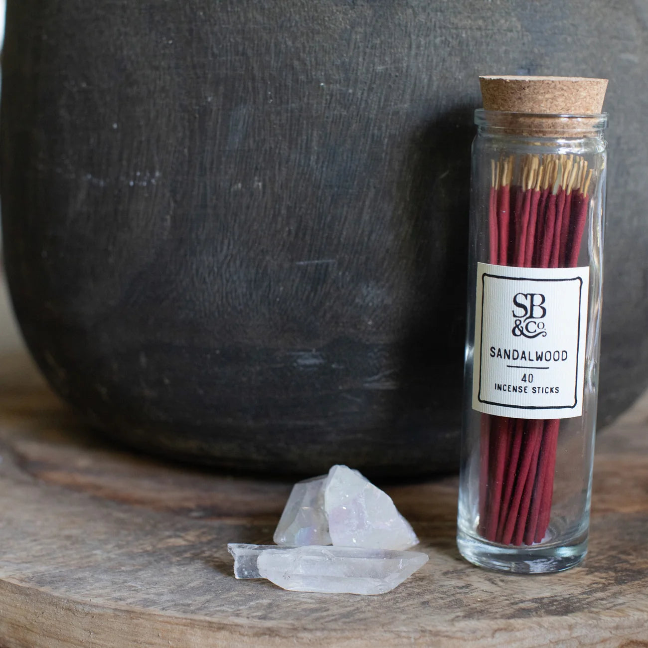 - 40 incense sticks in a glass jar with cork top lid (5.6" tall)