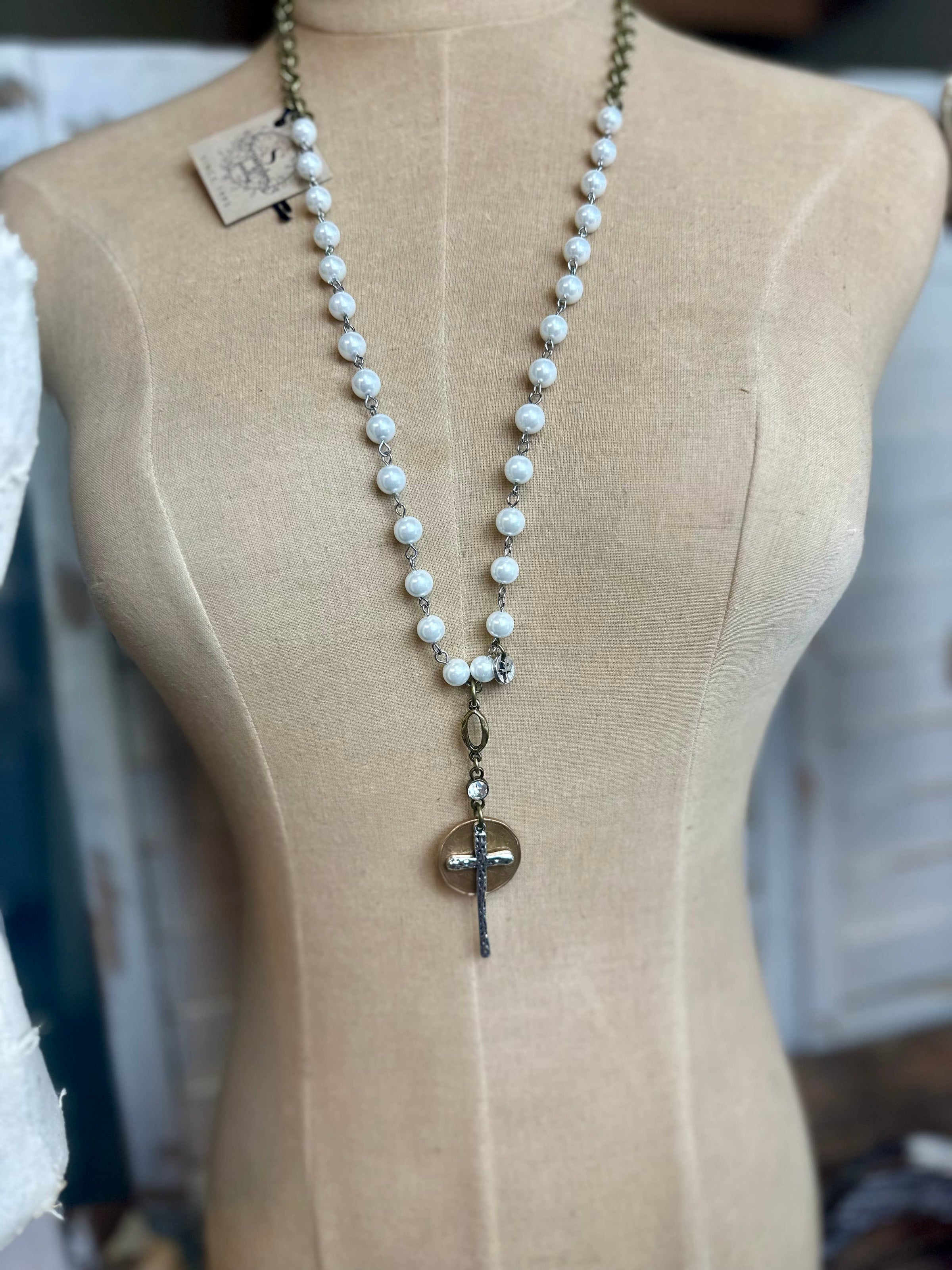 This necklace is awesome, it has pearl beaded chain connected to a bronze chain. It has a great antique gold link to connect the rhinestone component which attaches the Canadian coin and hammered cross.