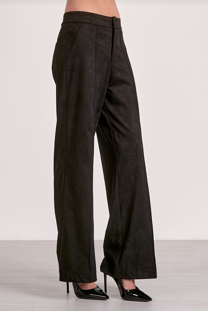 Constructed from buttery-soft faux suede, they feature a high waist and wide legs that create a streamlined silhouette to flatter every frame. The luxurious fabric drapes beautifully while maintaining structure, making it ideal for both professional settings and sophisticated evening wear. A wardrobe essential that transcends seasons and trends, these pants embody timeless style with modern sensibility.