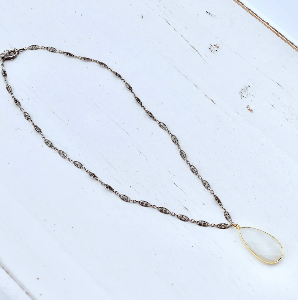 This is a faceted rainbow moonstone in a gold vermeil bezel on oxidized sterling silver filigree chain with an oxidized sterling silver lobster clasp enclosure. The necklace is adjustable from 16 - 18 inches long.