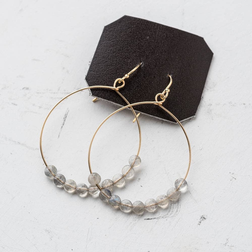 Featuring stunning labradorite coins and gold accents, these earrings will add a touch of shine and sophistication to any outfit. * Natural labradorite, approximately 4mm * 14k gold fill hoops and ear wires * Design measures about 1 ½ inches (without ear wire) * Earrings fall 2 inches from the ear piercing