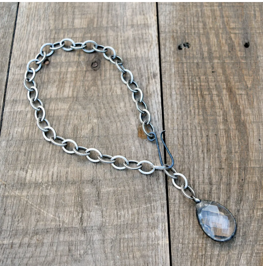 This is soldered faceted Crystal pendant on oxidized Pewter chain with an artisan forged Iron front hook enclosure. The necklace is adjustable up to 17 1/4 inches long and the pendant adds another 1 3/4 inches.