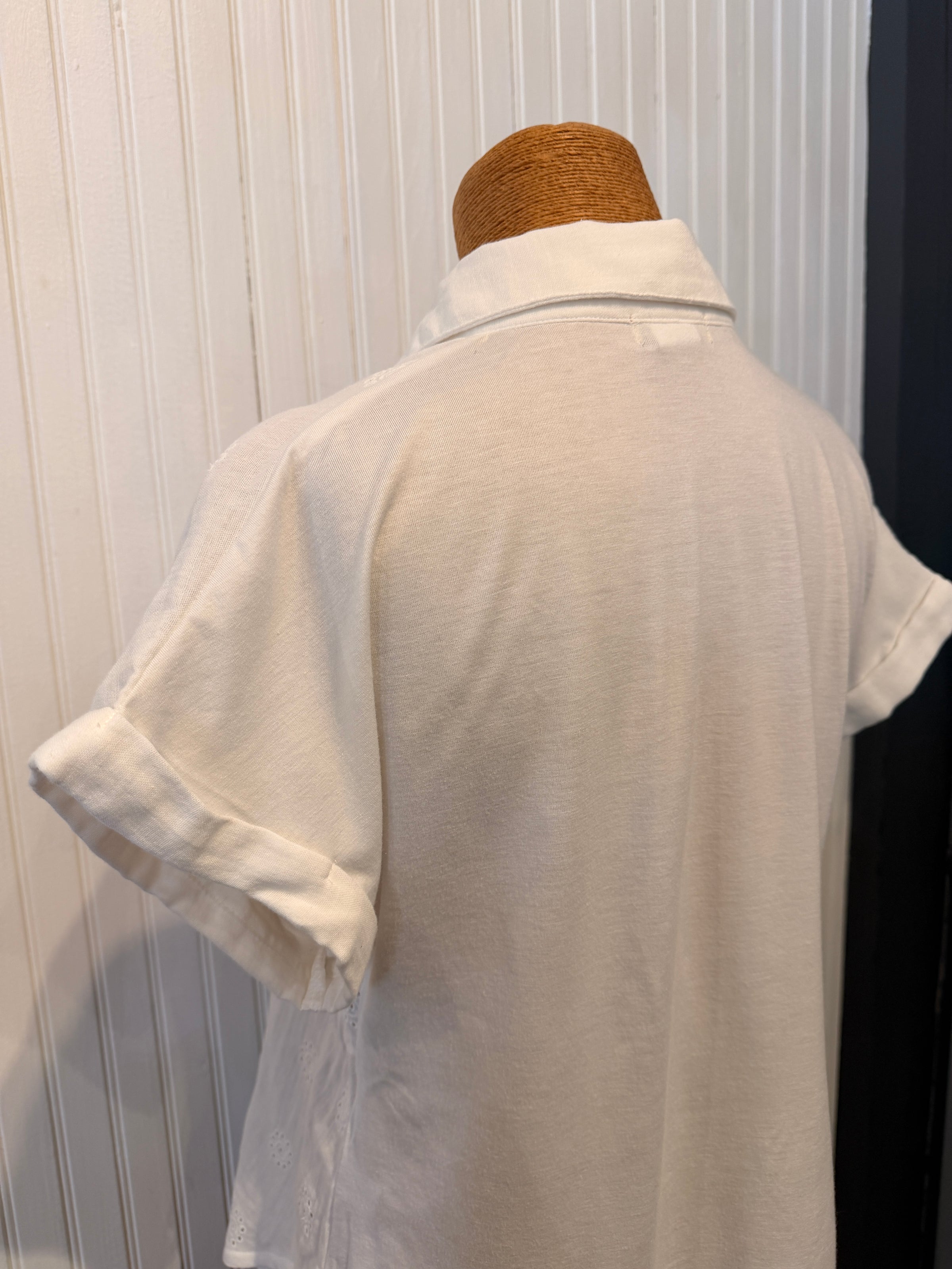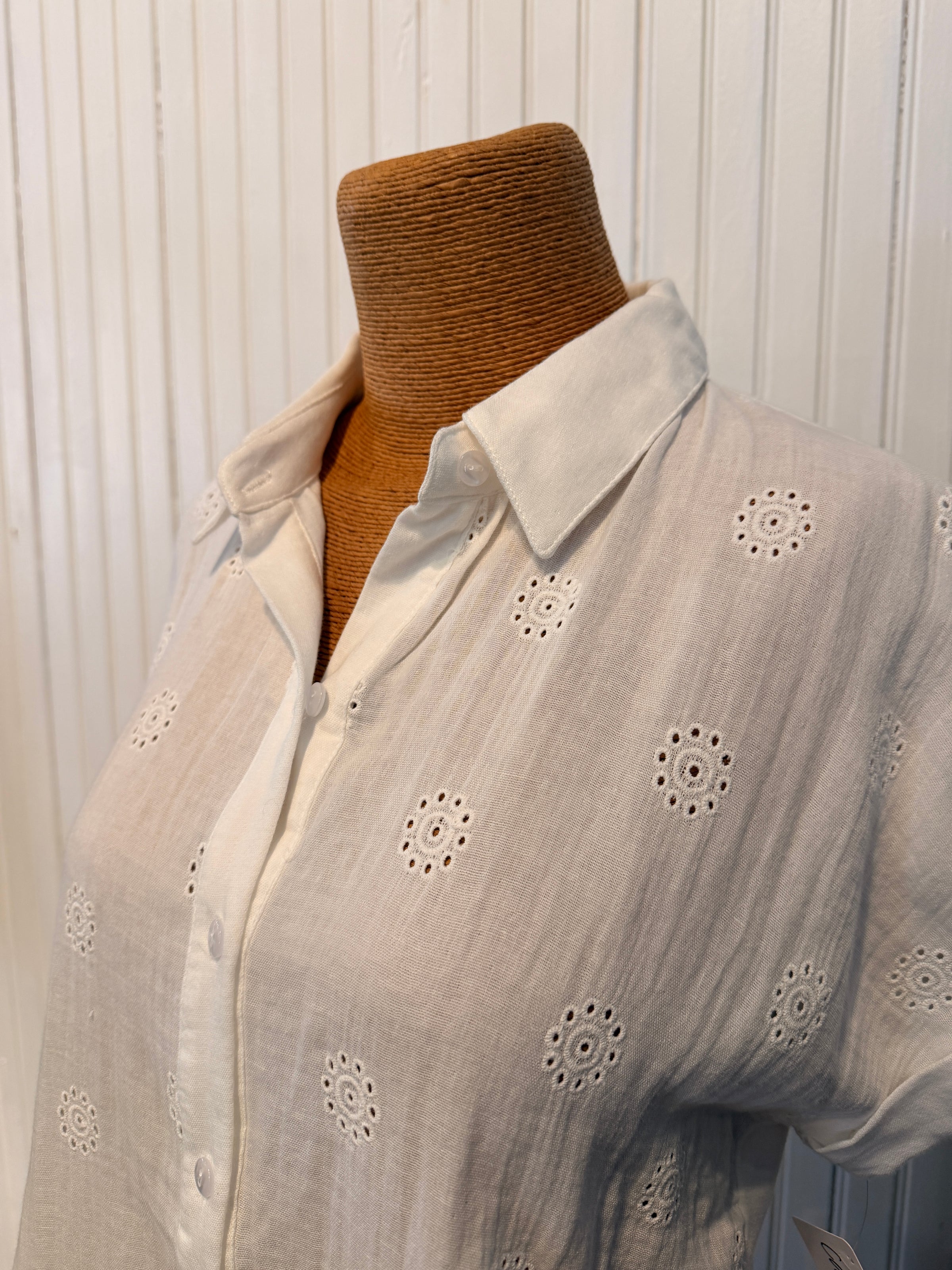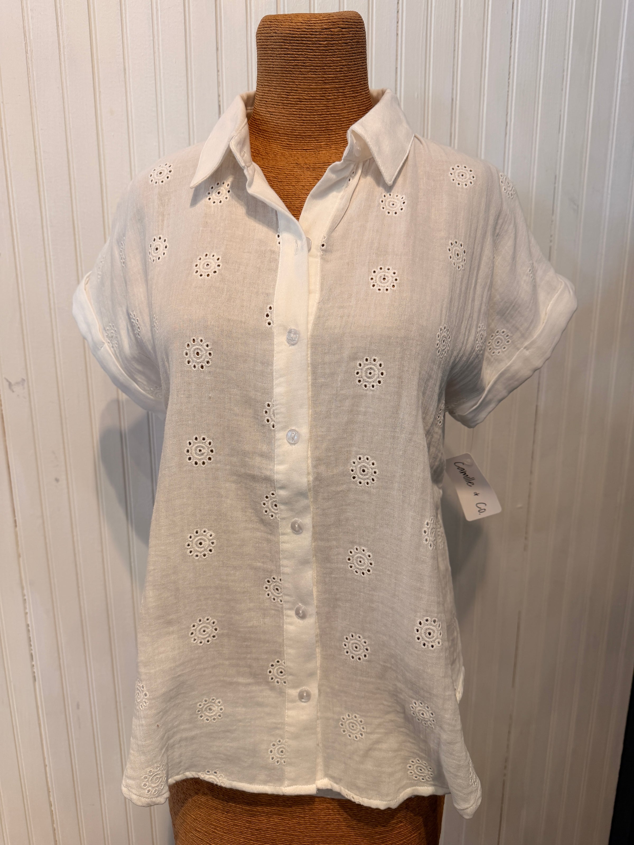 The delicate eyelet detailing adds a touch of feminine flair, while the classic collar and short sleeves keep things breezy and effortless. Perfect for layering over a slip dress, pairing with your favorite jeans, or wearing solo on warm days.