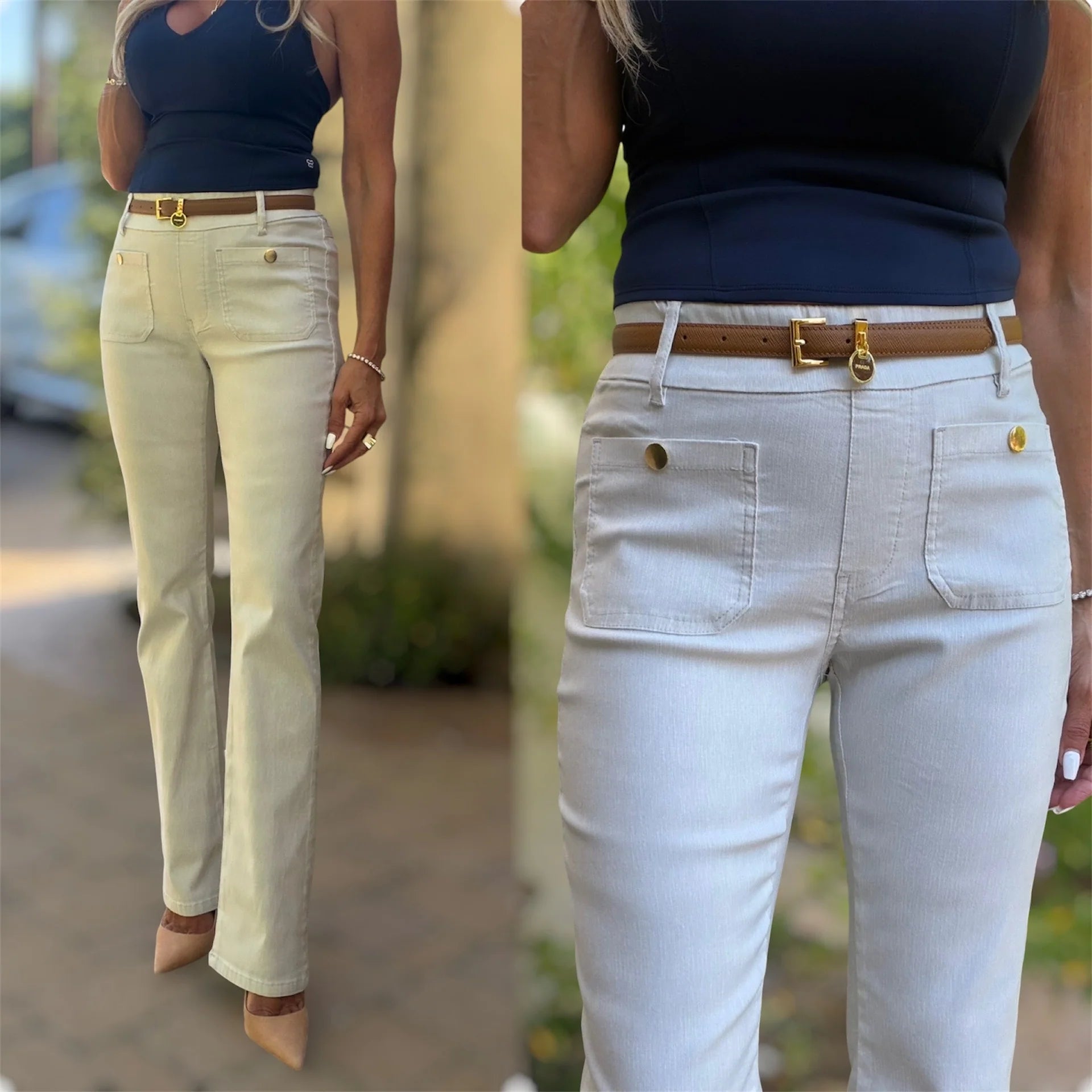 Jerome Beige Check with belt loops and a slight flare at the ankle, soft Fabric. 98% cotton 2% Lycra. Machine washable. Does not Wrinkle or Fade. Comfortable, Stylish, Very Flattering. Wear with Sneakers, Sandals, Booties, Heels. Wear it Casual or Dressy for Evening. Try them and you will see why these pants have been the #1 selling item in boutiques all around the U.S. Inseam: 31", Rise: 9.5".