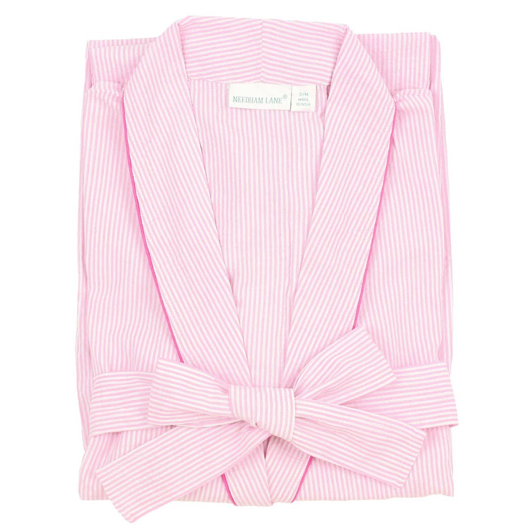 Traditional shawl collar bathrobe. Soft, 100% cotton yarn-dyed woven seersucker. Pink & white striped with dark pink piping. Hangs approximately 45" from shoulders. With fabric belt, side-seam pockets, and internal tie. Machine wash warm, tumble dry low.
